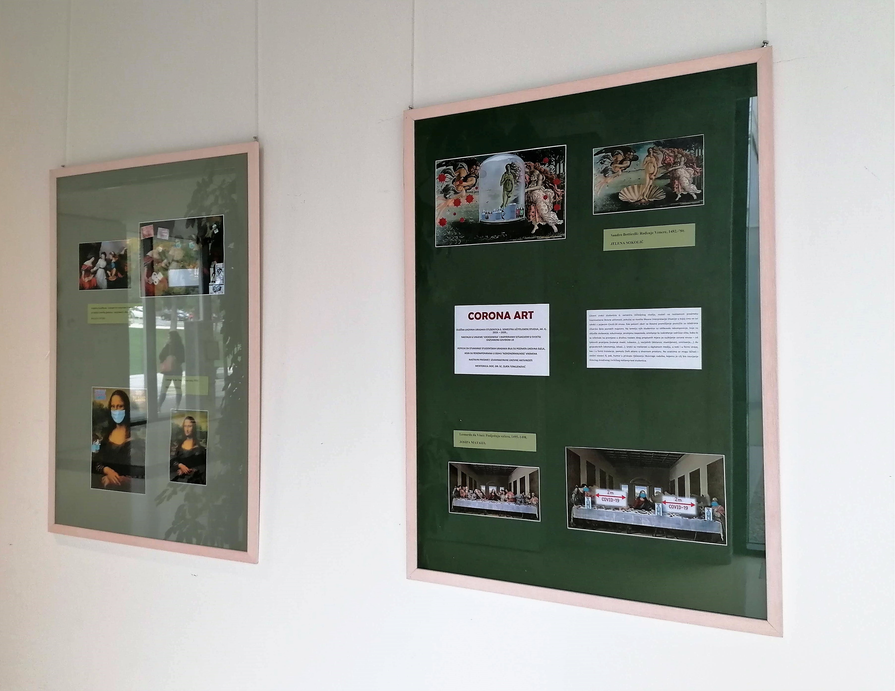 U petak, 23. listopada u holu Učiteljskog fakulteta postavljena je izložba likovnih uradaka studentica 6. semestra Učiteljskog studija ak.godine 2019./20.Radovi su inspirirani situacijom u svijetu izazvanom pandemijom COVID-19 a nastali su u vrijeme "lockdown-a" u okviru nastavnog predmeta Izvannastavne likovne aktivnosti.