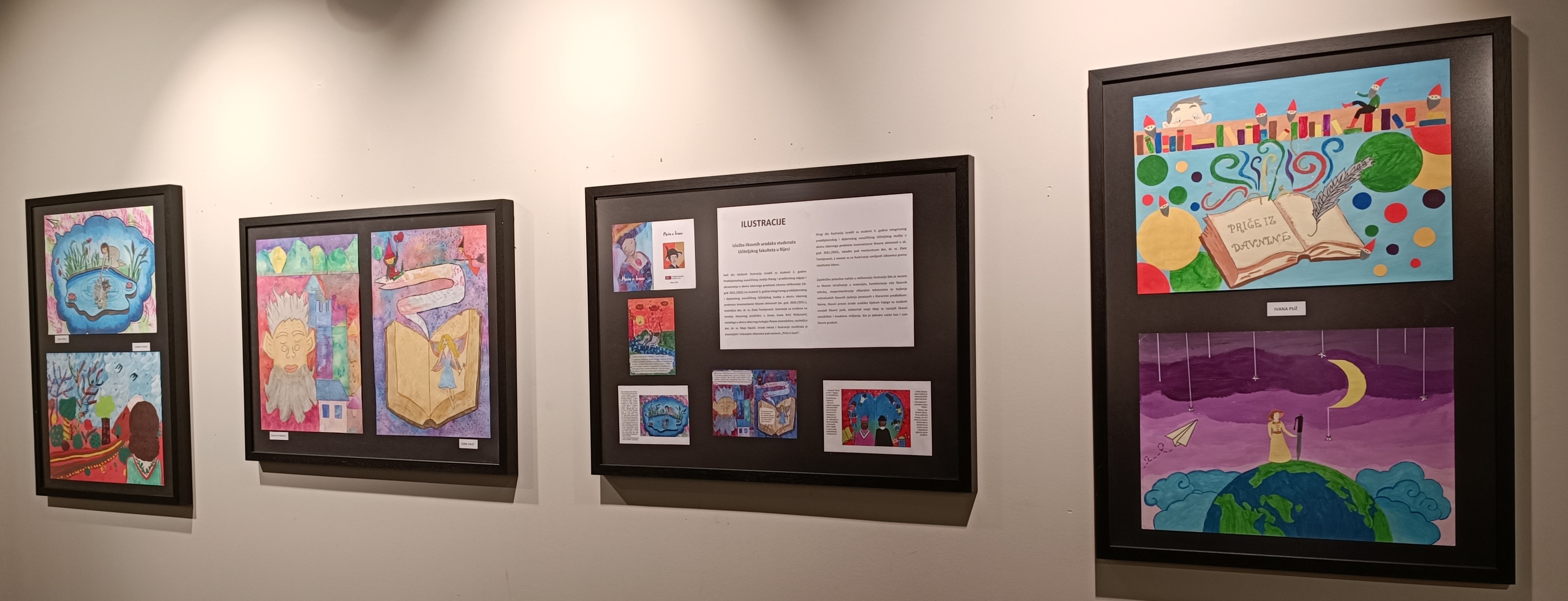 Najveći dio izložbe čine ilustracije nastale prema tekstu o životu i djelu naše poznate književnice Ivane Brlić Mažuranić, kojeg su također osmislili studenti u okviru izbornoga predmeta Pisano stvaralaštvo, nositeljice doc. dr. sc. Maje Opašić. Polazišno načelo u oblikovanju ilustracija bilo je vezano za istraživanje u materijalu, kombiniranje više likovnih tehnika, eksperimentiranje slikarskim teksturama te traženje individualnog likovnog rješenja povezanog s literarnim predloškom. Na temelju teksta i ilustracija nastalih prema njemu osmišljena je i tiskana slikovnica Priča o Ivani. Na izložbi također sudjeluju i studenti s ilustracijama nastalih prema slobodnom izboru omiljene slikovnice, za koju su osmislili vlastito vizualno rješenje naslovne strane.
