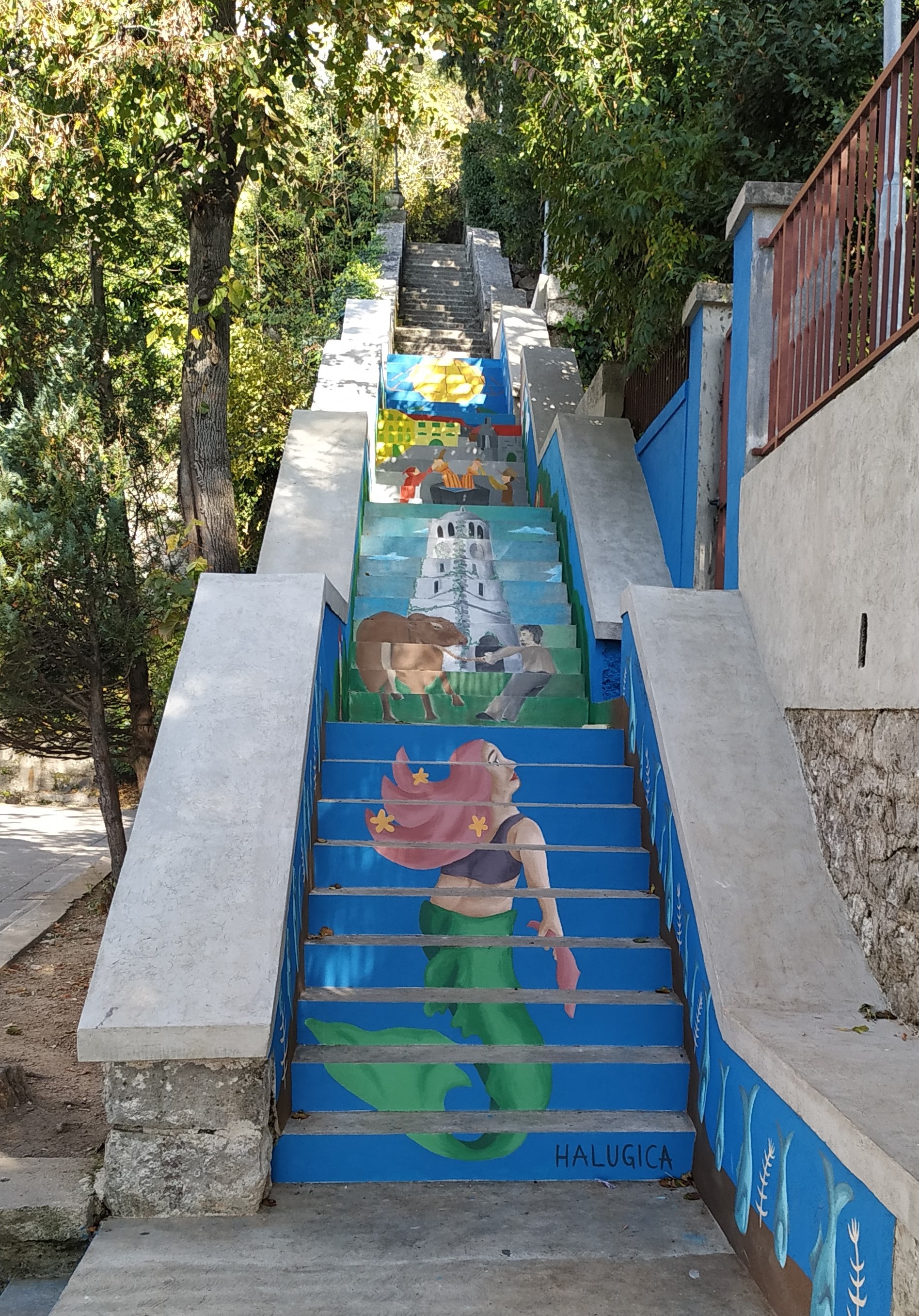 Faza realizacije projekta krenula je pripremom podloge i prenošenjem definiranog likovnog rješenja s papira na stepenište, što nije bio nimalo lak zadatak. Grad Kastav je dozvolio oslikavanje te prethodno obavio građevinske zahvate sanacije, a vatrogasci Dobrovoljnog vatrogasnog društva Kastav isprali su stepenište prije samog oslikavanja kako bi sve površine bile čiste. Učenici su sa studenticama Akademije i Učiteljskog fakulteta te mentoricom Majom Šikić započeli skiciranje petak tijekom popodneva, a subotu i nedjelju su uz pomoć i sugestije studentica oslikavali četrdesetak stepenica i bokove. Na prva četiri bloka oslikani su motivi iz štorija: Halugica, Kako su Kastavci seli sol i sadili sardelice, Kako su Kastavci bacili kapetana u Lokvinu, Štorija od Šparožne jami. Pojavljuje se i lik Malika. Na bočnom zidu oslikan je portret Vladimira Nazora s pogledom na Kvarner. Iako Halugica nije kastavska legenda, nego je njezin autor Nazor, ona je ipak važna jer je nastala nadahnuta našim legendama s kojima se autor upoznao dok je živio i djelovao u Kastvu.
